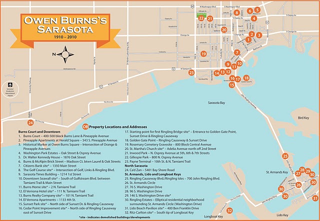 Special events are scheduled throughout the city in honor of his work begun 100 years ago. Highlights of the week-long celebration include historic tours, special exhibits and programs, the book release of “Owen Burns, The Man Who Bought and Built Sarasota”, and conclude with a festive street party in historic Burns Court.