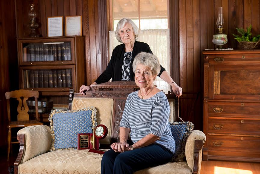 Historical Society of Sarasota County’s 2016 award recipients: Sue Blue (standing) and Norma Kwenski (seated) in the parlor of the Bidwell-Wood House, the oldest residence in Sarasota County. Photograph courtesy of Virginia Hoffman.