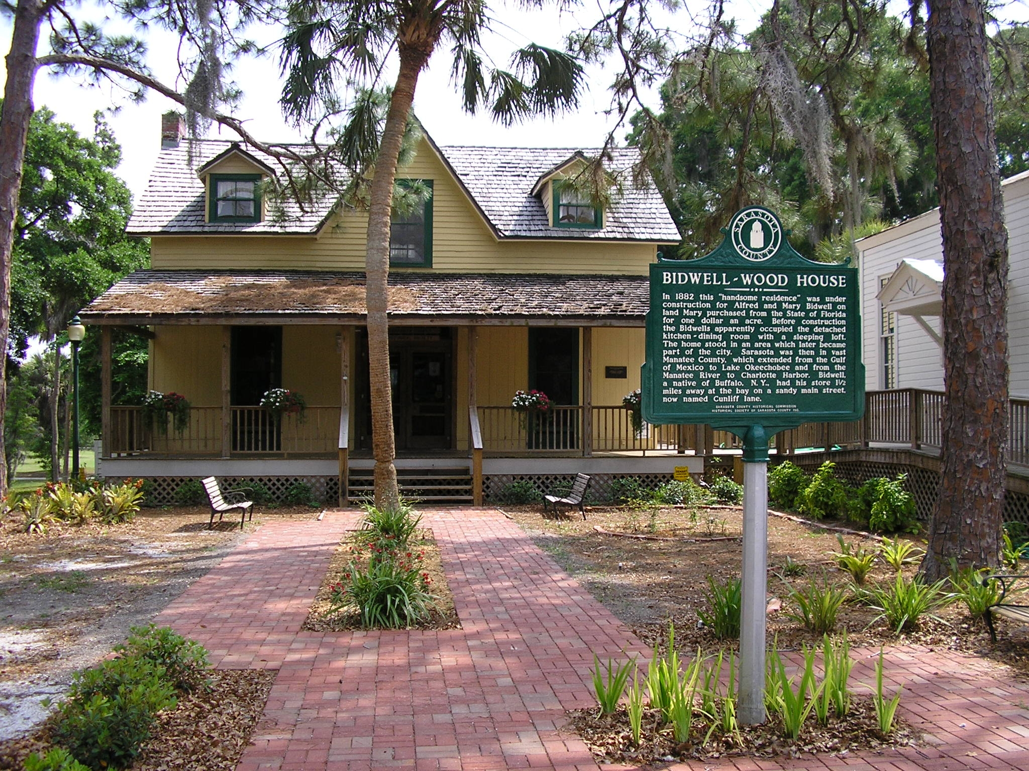 The Historical Society of Sarasota County salvaged the bricks from Main Street and Lemon Avenue when the station depot was being demolished. We have them laid as the walkway into the 1882 Bidwell-Wood House, Sarasota County’s oldest surviving residence, for a lasting memorial.