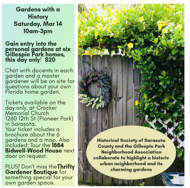 Receive your tickets, $20, at Crocker Memorial Church, the Historical Society’s gathering place at 1260 12th Street, Sarasota. Your ticket includes a tour of the historic Bidwell-Wood House in Pioneer Park. See the beautiful Historical Society Gardens, receive your map, take a quick drive to Gillespie Park and follow your map to experience 6 unique private residential gardens that will delight and inspire. For additional information 941-364-9076 (the Historical Society office.)
