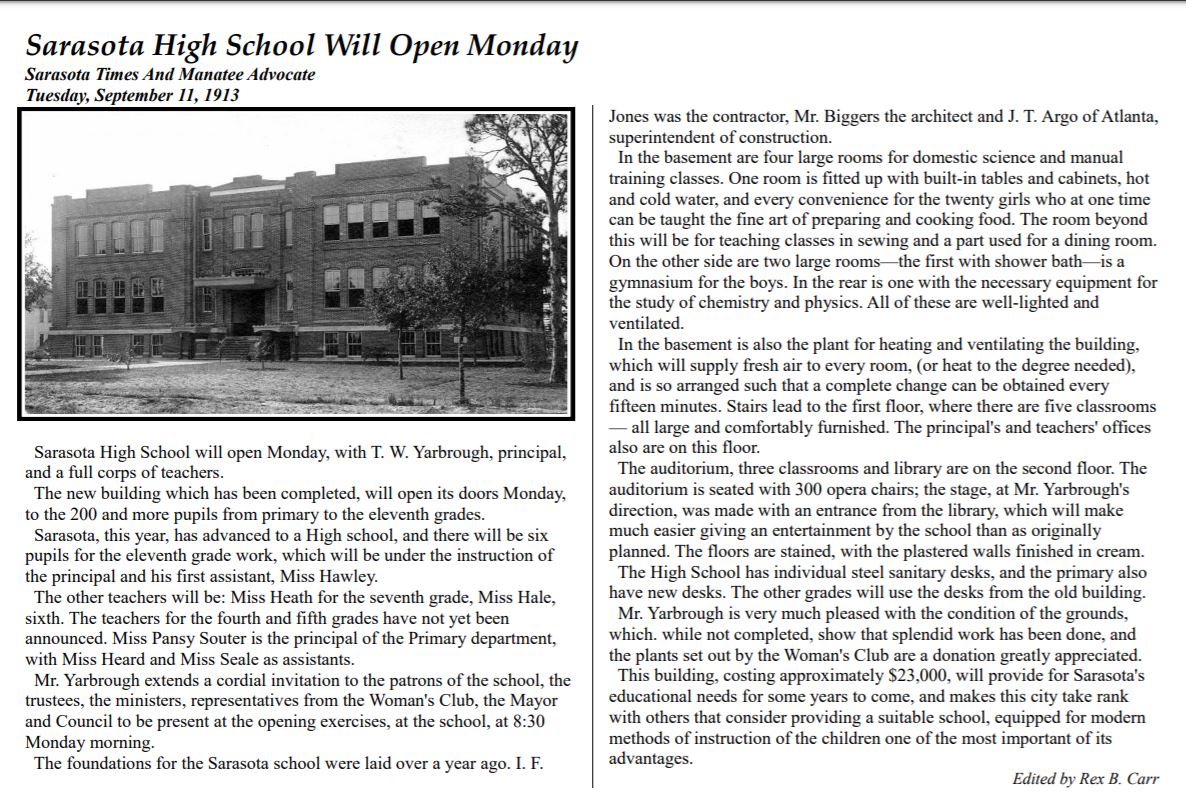 Thomas Wayland Yarbrough was the standard-bearer for Sarasota schools for nearly four decades. He came to Sarasota in 1907 to lead the public schools and, with the exception of three years in Mulberry, remained until his retirement in 1945. Read about Mr. Yarbrough.