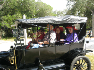 HSOSC Member Lois Greer brought her Red Hat group to the Historical Society for an outing recently. Docent (and HSOSC Prez) Howard Rosenthal was on hand to greet them as they drove up 12th Street in a bevy of pre-WW1 automobiles driven by Lois’ husband Ed and his fellow old-car enthusiasts.