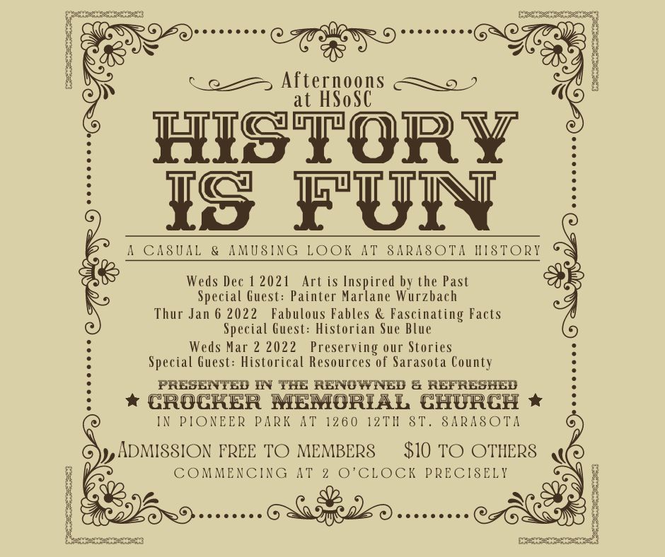 and call the Historical Society to reserve your spot on this fall’s exciting events. Call us at 941-364-9076 Tues.-Fri. between 10am and 2pm. Mastercard & VISA accepted!